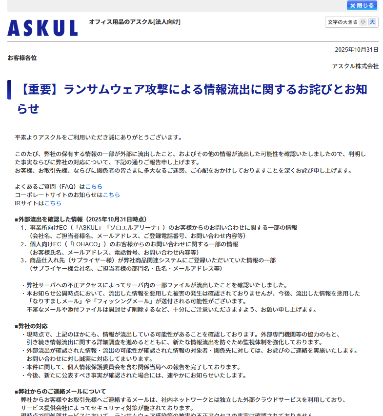 続きを読む - 【公式】アスクル:ランサムウェア攻撃による情報流出に関するお詫びとお知らせ