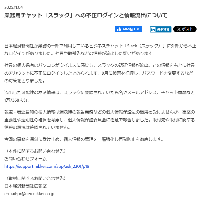2025年11月、日本経済新聞社が利用する業務用チャットツール「Slack」に対して不正ログインが確認され、従業員や取引先など **約1万7,400人分の情報が流出した可能性** があることが判明しました。