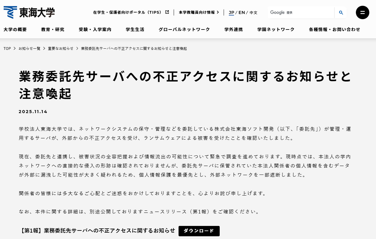 - Yahoo!ニュース:東海大学、委託先サーバーがランサムウェア被害 教職員や学生などの個人情報流出の可能性
