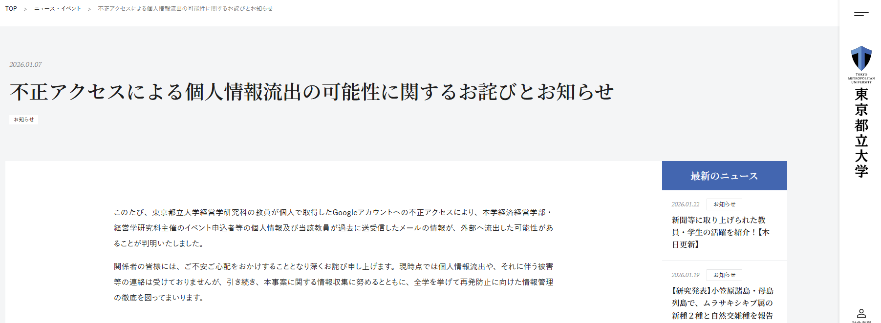 このたび、東京都立大学経営学研究科の教員が個人で取得したGoogleアカウントへの不正アクセスにより、本学経済経営学部・経営学研究科主催のイベント申込者等の個人情報及び当該教員が過去に送受信したメールの情報が、外部へ流出した可能性があることが判明いたしました。・・・・・