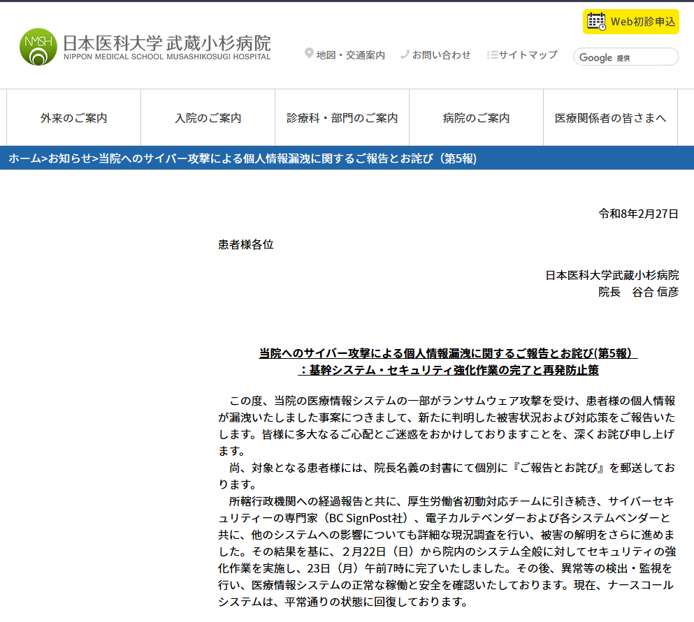 日本医科大学武蔵小杉病院は、当院の医療情報システムの一部がサイバー攻撃(ランサムウェア攻撃)を受け、患者約13万人分の個人情報漏洩が確認されたと公表した。病院の第5報では、攻撃を受けたシステムとしてナースコールシステムサーバー等を挙げ、侵入経路は医療機器保守用VPN装置の脆弱性を悪用した不正アクセスだったとしている。