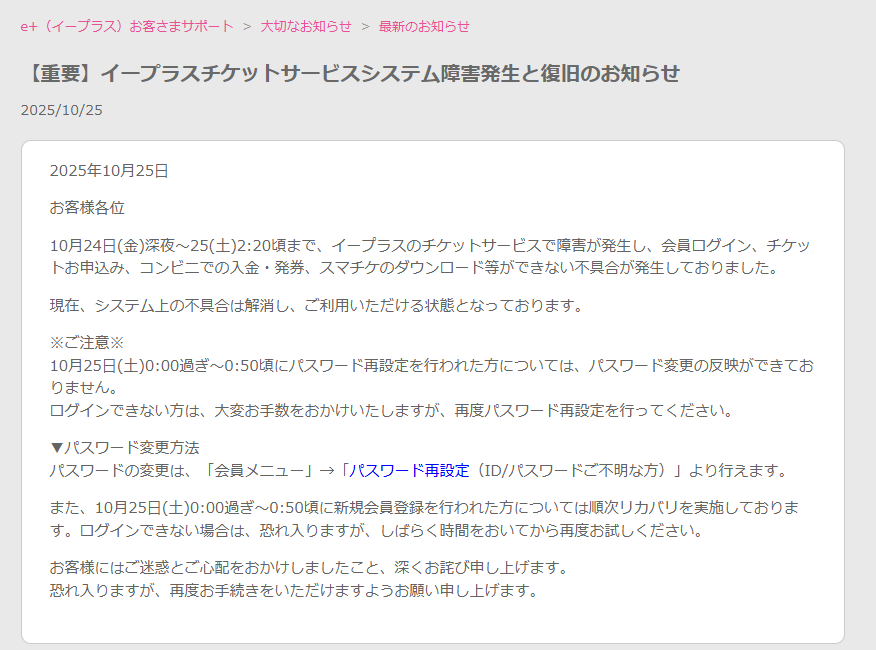 同社が導入している顔認証システムに関連する障害が発生し、一部の会場で入場者確認ができなくなるトラブルが報告されました。システム障害は一時的に広範囲へ影響を及ぼしましたが、その後、原因調査および復旧対応が行われ、サービスは順次正常化しています。