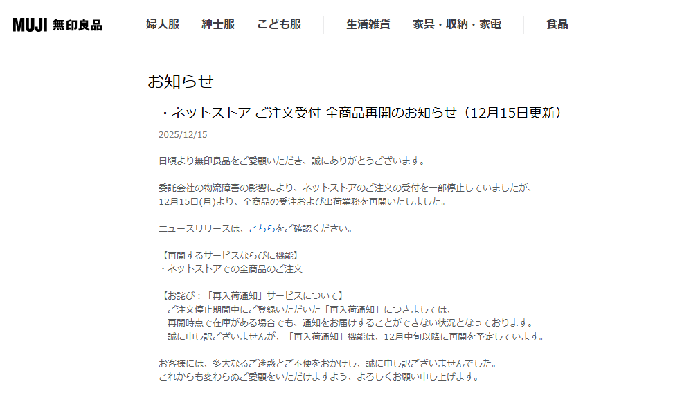 2025年10月、無印良品のネットストアは、業務提携先であるアスクルのシステム障害(ランサムウェア被害)の影響を受け、サービスを一時停止していましたが、約2か月を経て、12月15日から全面再開しました。